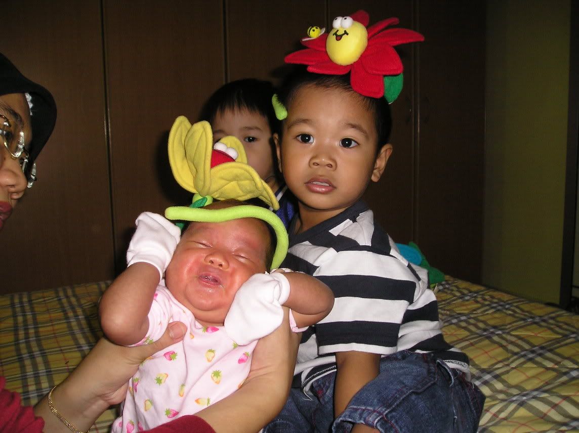 Doncha juz love them??? esp e new flavour of the month, Lil Princess Aliyah..Btw, I asked Muqbil & Mukhair(no point askin Mukhair as he doesnt understand a word I am sayin..heh)whether dey loved Aliyah as dey keep smotherin her wit kisses..of coz, dey said yes..I asked them whether dey would wan a baby sister..dey said yes..I told them to ask their mummy for a baby sis..n immediately dey went to her n asked her..hahahaaaaaa!!! Their mummy claimed tat her shop is closed but we'll c.. :)
