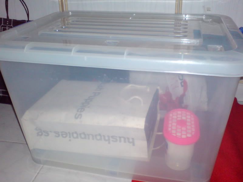 I bot a huge container wit wheels to keep e gifts..If u look closely, wat can u c? Thirsty Hippo!! Hehehe!! Absorb all e moisture mah! I got leather shoes in there n I wan them to be in tip top condition till my weddin! :)