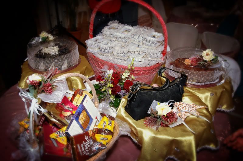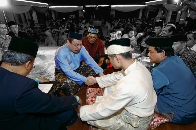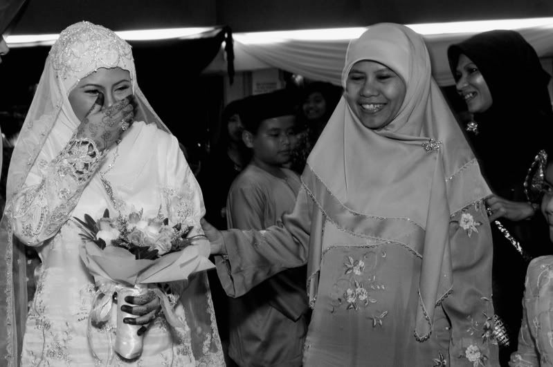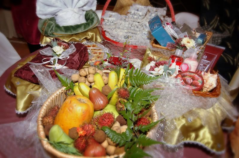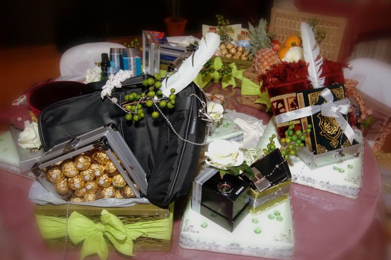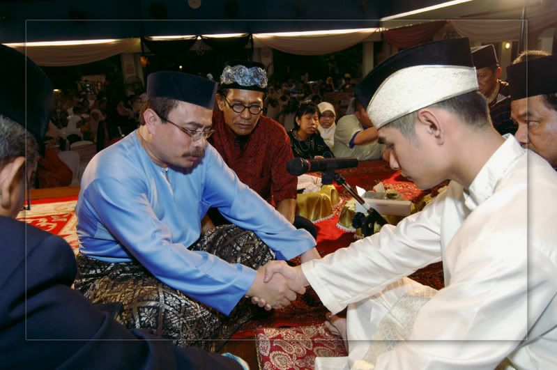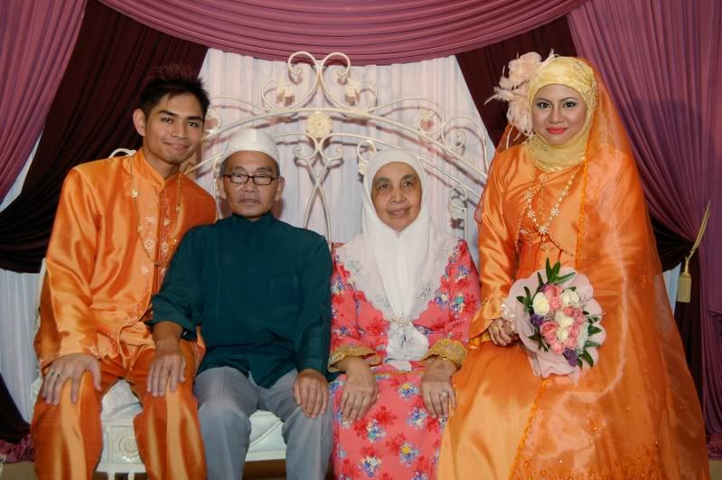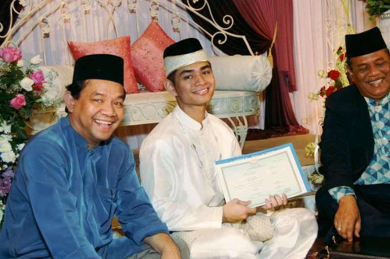 My gifts for my Darling, exclusively made by Kak Anis from Innovazione.. :D Gifts for Me from my Darling, exclusively made by his aunt.. :) More gifts for me.. :D As I entered e CC, people kept teasing me! Malu la!! Lovely setting.. My daddy did the honours of marrying me off..I was busy trying to keep calm under the strong spotlight and glances of the guests..My mak andam told me, 'Adik, your abah nikahkan you.' I said, 'No, I dont think so.' Then, she told me to look at my dad..Goodness!! Noone knew my daddy was going to do that!! Hehehe!! What a pleasant surprise!! So how many times did my Darling had to recite? One, baybeh!! My dad had to recite 3 times!! Hahaha!! Tu la, never practice in advance! Abah, you really surprised all of us!! Signing away happily.. Signing my life away happily too.. :) We're married!! Alhamdulillah!! Oooohh!! Darling (now can be called Hubby) is approaching me!!  :) Pucker up, buttercup! First halal-ed kiss.. ;) Hubby putting on my maskawin(bracelet).. After I sarungkan his cincin.. :) Two beautiful souls have finally became 1..Alhamdulillah.. I absolutely love this pic!! 2nd outfit for the solemnization night.. The Zaren family with the latest member.. :) My granduncle and his wife who came all the way from KL to attend my wedding.. :)There are lots and lots more pictures to share..And I shall share them soon..Got to go now!! Need to get ready to sembah-sembah..Tata!!! :*