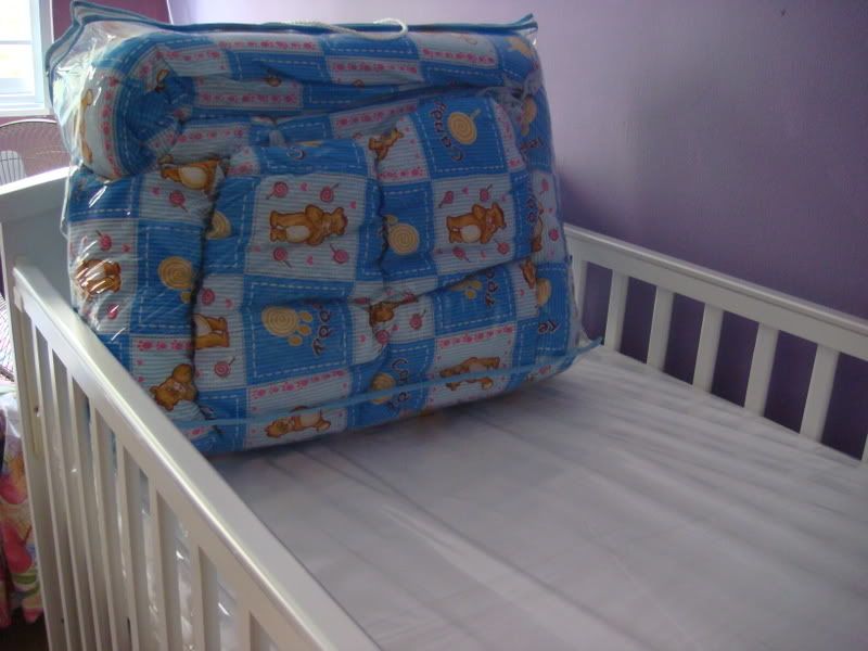 The free 9 piece bed set given when the cot was bought..Why blue? Cos blue is suitable for a boy or girl..But if it is pink, it is only suitable if Peanut's a girl..There's only blue or pink set so we chose blue.. :)